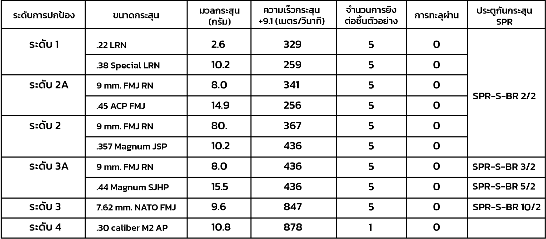 ระดับชั้นของการออกแบบประตูเหล็กนิรภัยพื่อคัดแยกชั้นคุณภาพของประตูเหล็กนิรภัย NIJ ได้แบ่งระดับการทดสอบโดยใช้ขนาดของกระสุนและค่าความเร็วของหัวกระสุน ไว้ดังนี้