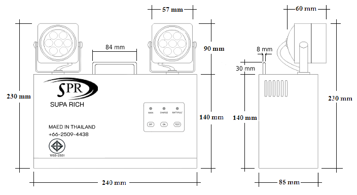 วัสดุตัวถังโคมไฟฉุกเฉิน ตัวกล่องทำจากแผ่นเหล็ก Electro galvanized หนา 1 มิลลิเมตร พ่นเคลือบด้วย Epoxy power coated ป้อมกันการเกิดสนิม