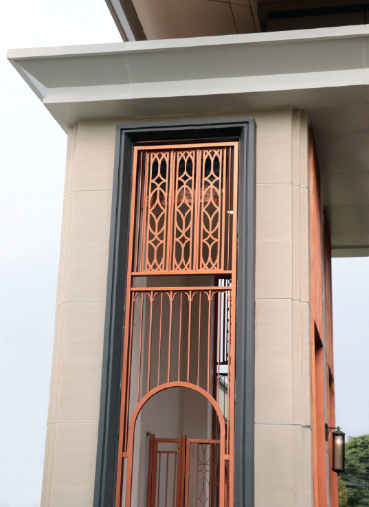 ฟาซาดอยู่ภายนอกของตัวอาคารมีหน้าที่ให้ความสวยงาม สร้างเอกลักษณ์ให้ดูโดดเด่นให้กับอาคาร ช่วยคอยบังสายตาจากบุคคลภายนอกอาคาร ป้องกันแดดที่จ้าเกินไป ช่วยลดความร้อนและยังช่วยให้ร่มเงาโดยที่ลม หรือ อากาศยังสามารถถ่ายเทผ่านช่องว่างของฟาซาดได้ วัสดุที่ใช้กับฟาซาดคือเหล็ก เหล็กจะมีความแข็งแรง ทนต่อการใช้งานกว่าวัสดุอื่นๆ