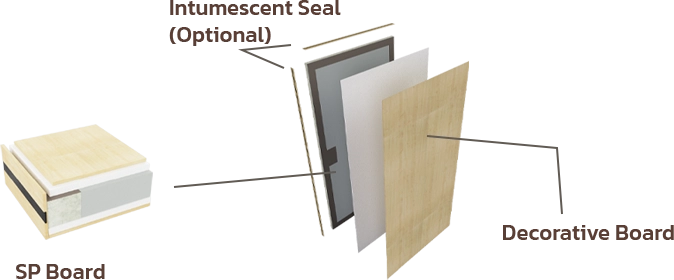 ประกอบด้วย แผ่นบอร์ดทนไฟ SP Board ความหนาแผ่น 25 มม. ปิดทับด้วยแผ่น MGO (Magnesium Oxide Board) ทัง 2 ด้าน และด้านรอบสันบานประตูเสริมยาง INTUMESCENT