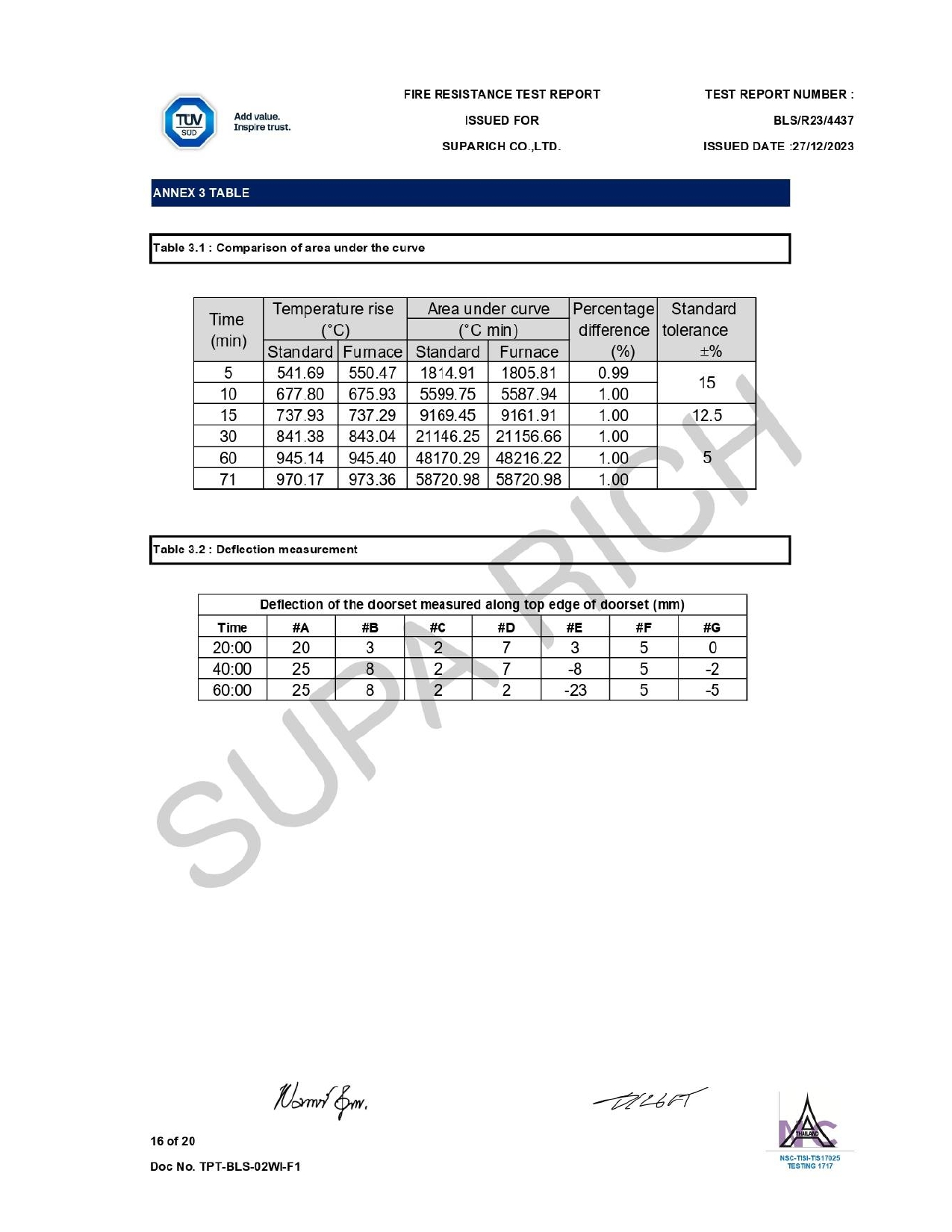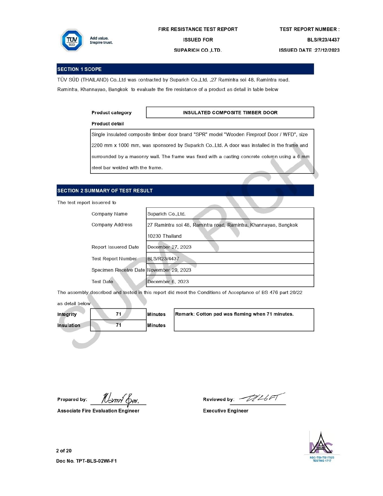 - ความหนามาตรฐานของบานประตูไม้ทนไฟ ศุภริช (SPR) มความหนา โดยรวมอยู่ที่ 45 มม. (±1) และวงกบประตู มความหนา 100 มม. วัสดุวงกบ ทําจากแผ่น Fiber Board ปิดทับด้วยแผ่น MGO (Magnesium Oxide Board) หรือวงกบเหล็ก
