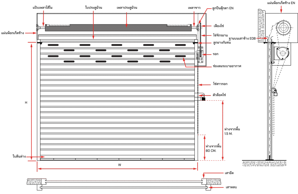 • 1.ประตูม้วนทนไฟ จะมีอุปกรณ์สำหรับใช้ตรวจจับความร้อนที่เกิด